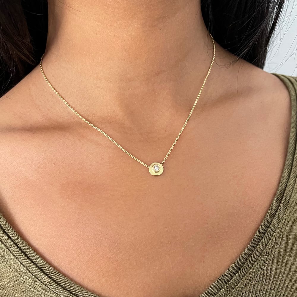This 18K diamond single stone necklace is a beautiful piece on just about anyone- it's got a handmade feel and sits in just the right place around the neck, as the stone is fixed in place. The disc is about 9mm, so 1/3 inch in diameter.